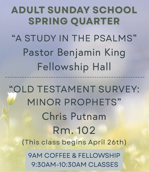 Come learn with us as we study a variety of topics related in God's Word. We have classes for all ages. Join us for coffee and refreshments beginning at 9am in the Fellowship Hall.