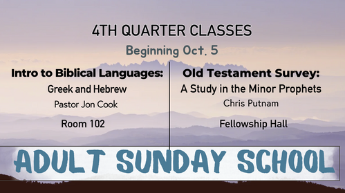 Come learn with us as we study a variety of topics related in God's Word. We have classes for all ages. Join us for coffee and refreshments beginning at 9am in the Fellowship Hall. .