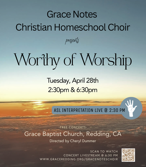 Grace Notes Choir exists to glorify God though the development of music in the lives of Elementary, Junior, and High School Homeschoolers from all across the greater Redding area. If you love to sing and desire to learn music theory, this is a place for you to learn musical skills as you grow in your relationship with the Lord.